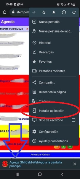 Si utiliza un dispositivo con un navegador Chrome, puede instalar como WebApp (lo cual no ocupará espacion en el celular) haciendo click en la leyenda inferior (señalada con la flecha azul) De no aparecer, o haber aparecido y haberlo cerrado, puede ir a opciones y presionar sobre "Instalar aplicación" (señalado con el óvalo rojo)