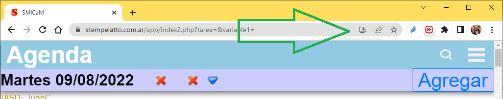 Si utiliza un navegador en PC, el ícono para instalar aparece en la barra superior de navegación (señalada con la flecha verde) |